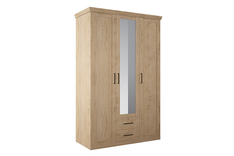 Модель оформлена в модном индустриальном стиле. Фасады имеют рамочную конструкцию, средний оснащен вертикальной зеркальной вставкой, облегчающей процесс сборов. Светлая древесная текстура корпуса стильно контрастирует с темным цветом внутренних стенок и фурнитурой в оттенке «черное античное железо». Направляющие и петли снабжены демпферами и доводчиками, обеспечивающими бесшумную эксплуатацию мебели.