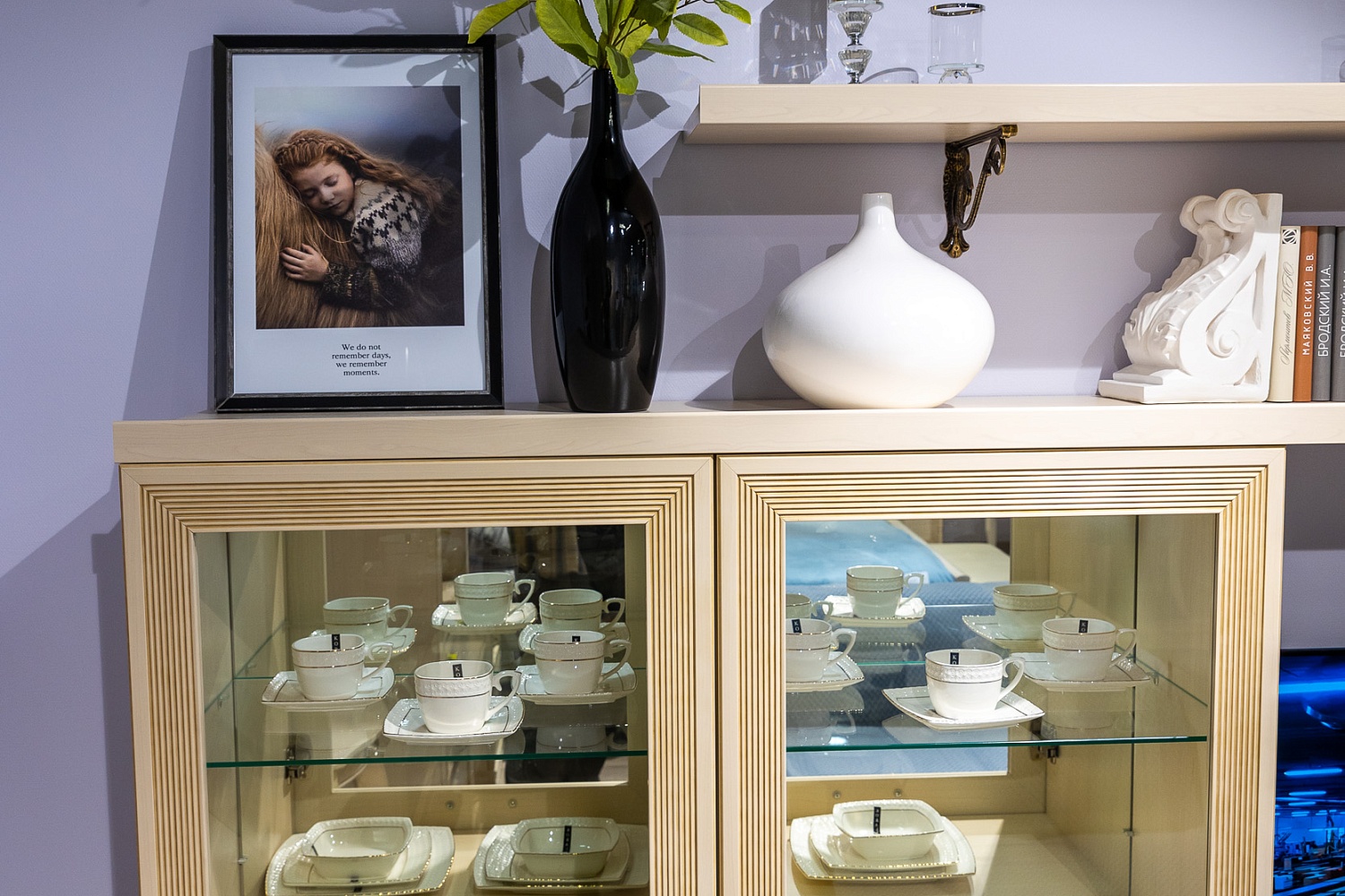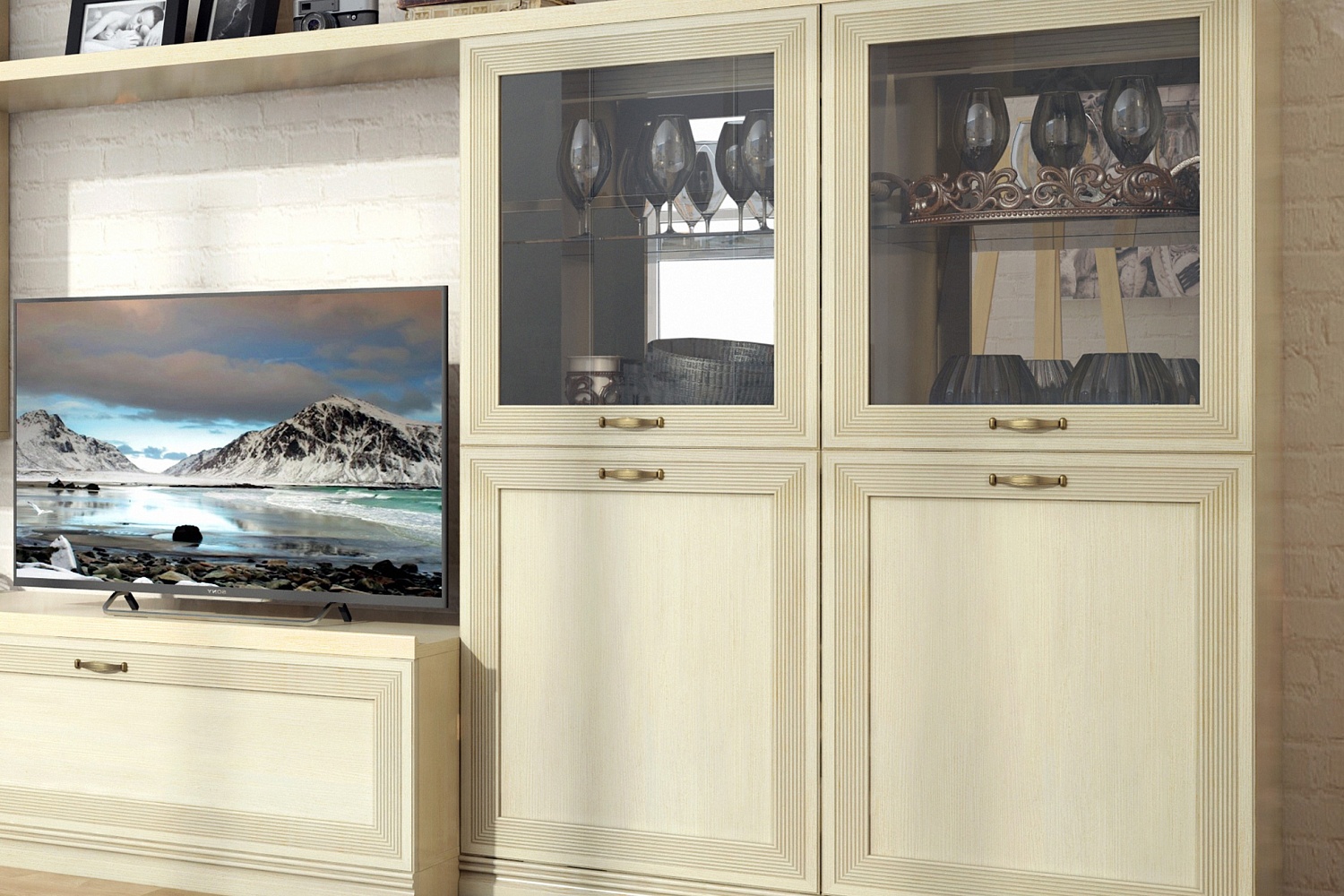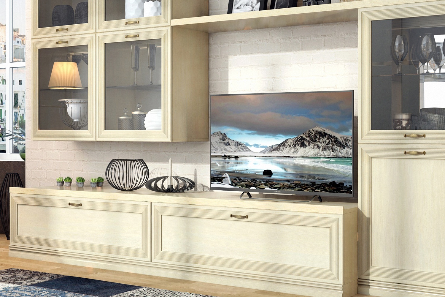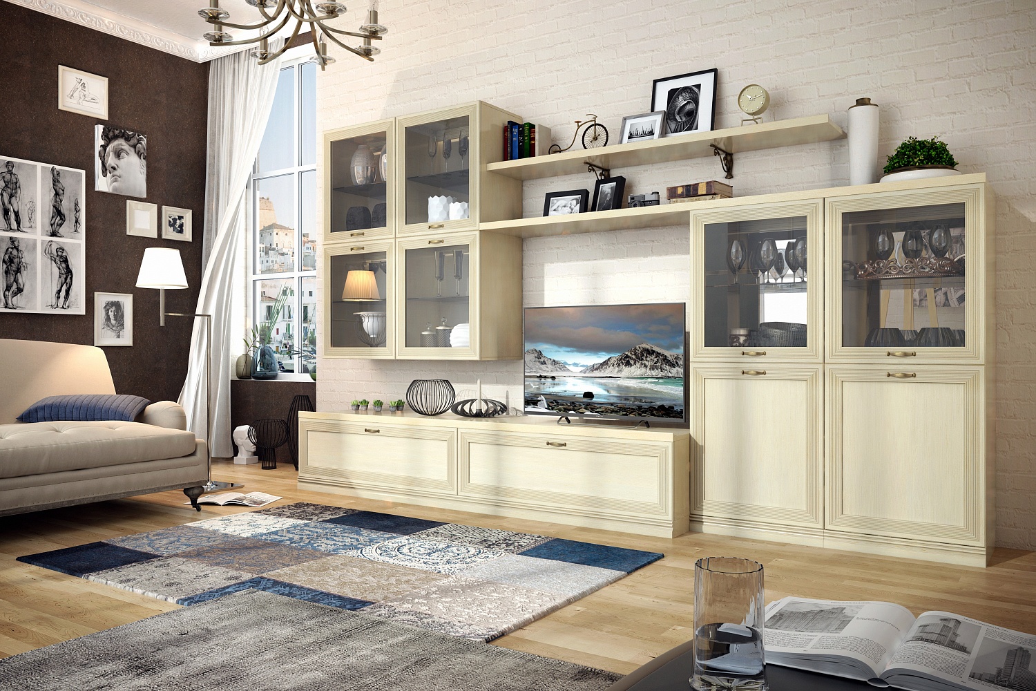 Модульная система позволит регулярно менять внешний вид гостиной по своему усмотрению. В комплект входит два навесных шкафа-витрины, напольные шкафы с застекленными вставками и глухими нижними фасадами, настенные полки и вместительная ТВ-тумба.
