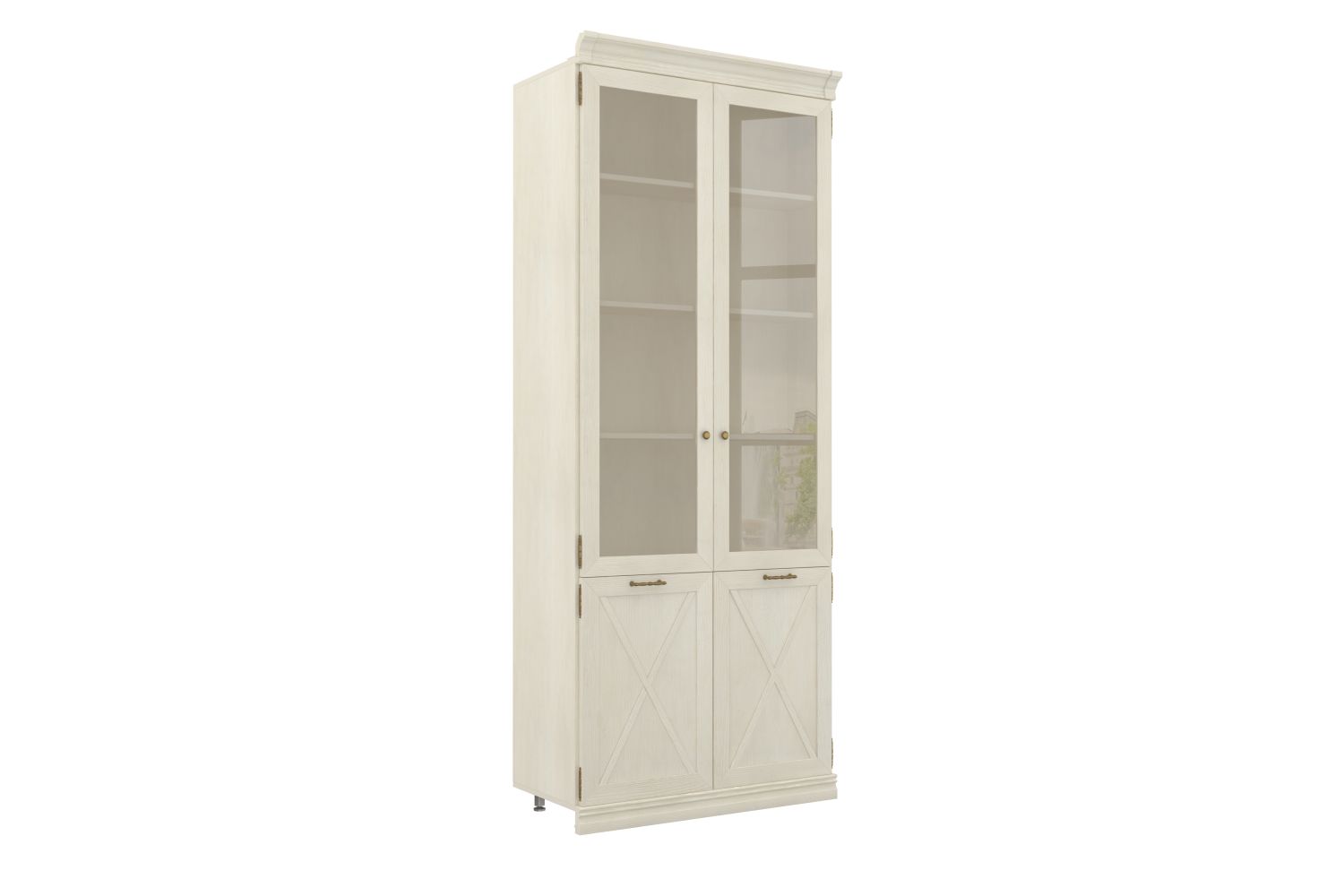 - В верхнем отделении — три съемные полки ЛДСП за двумя распашными рамочными дверями (вставки стекло), в нижнем отделении — одна съемная полка ЛДСП за двумя распашными рамочными дверями;