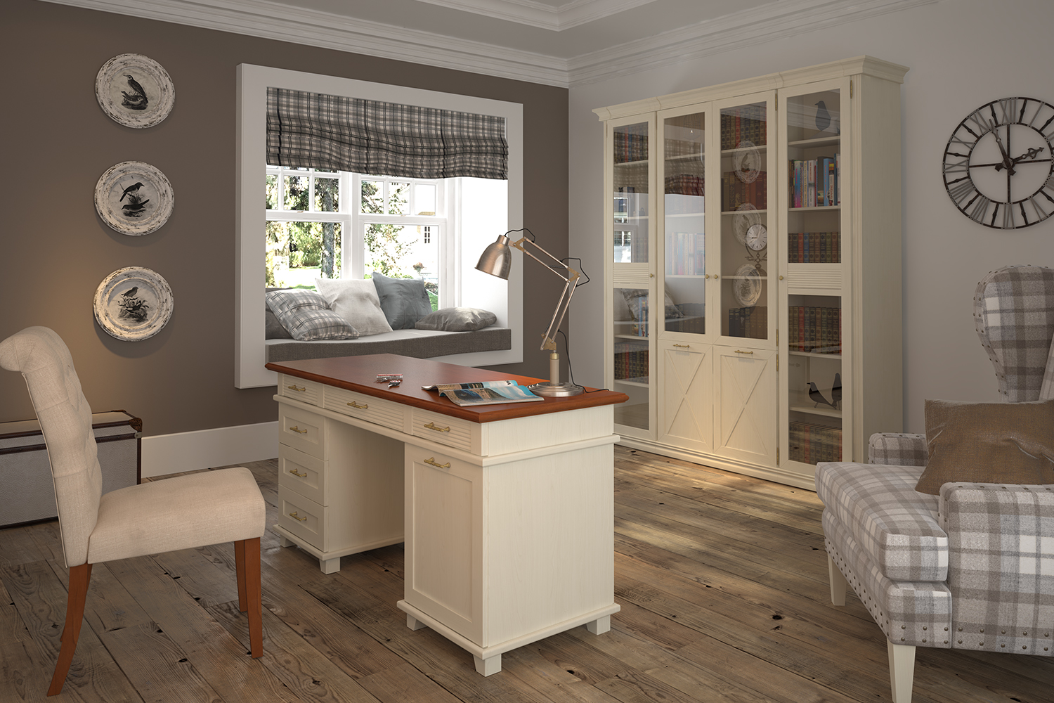 - Фасады: рамочной конструкции из профиля МДФ, окутанного бумагой с «финиш-эффектом». В «глухих» фасадах — вставки из ЛДСП 0,6 см (с приклеенными профилями МДФ — фахверками), в фасадах со стеклом — вставки из прозрачного стекла;