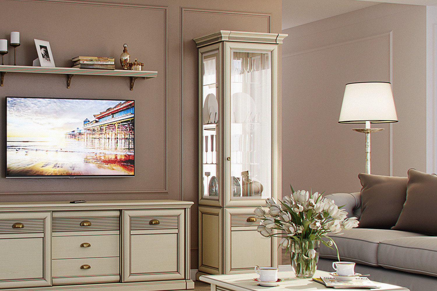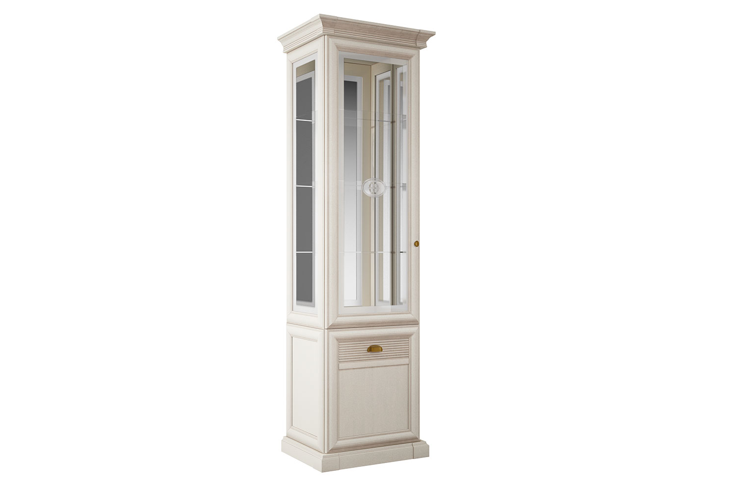 Узкий вертикальный напольный шкаф подойдет для оформления гостиной в классическом стиле. Гладкость и прочность изящным рамочным фасадам придает двухслойный лак. В сочетании с нанесенной вручную патиной такое покрытие обретает благородный налет старины. Базовый цвет «валенсия» подчеркнут латунной фурнитурой, окрашенной в оттенок «античная бронза».