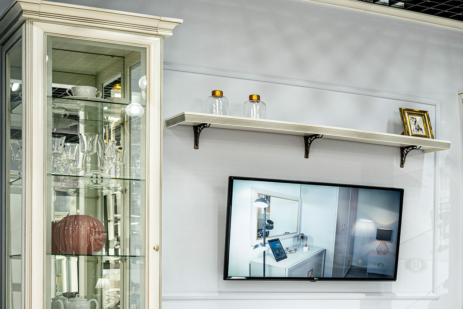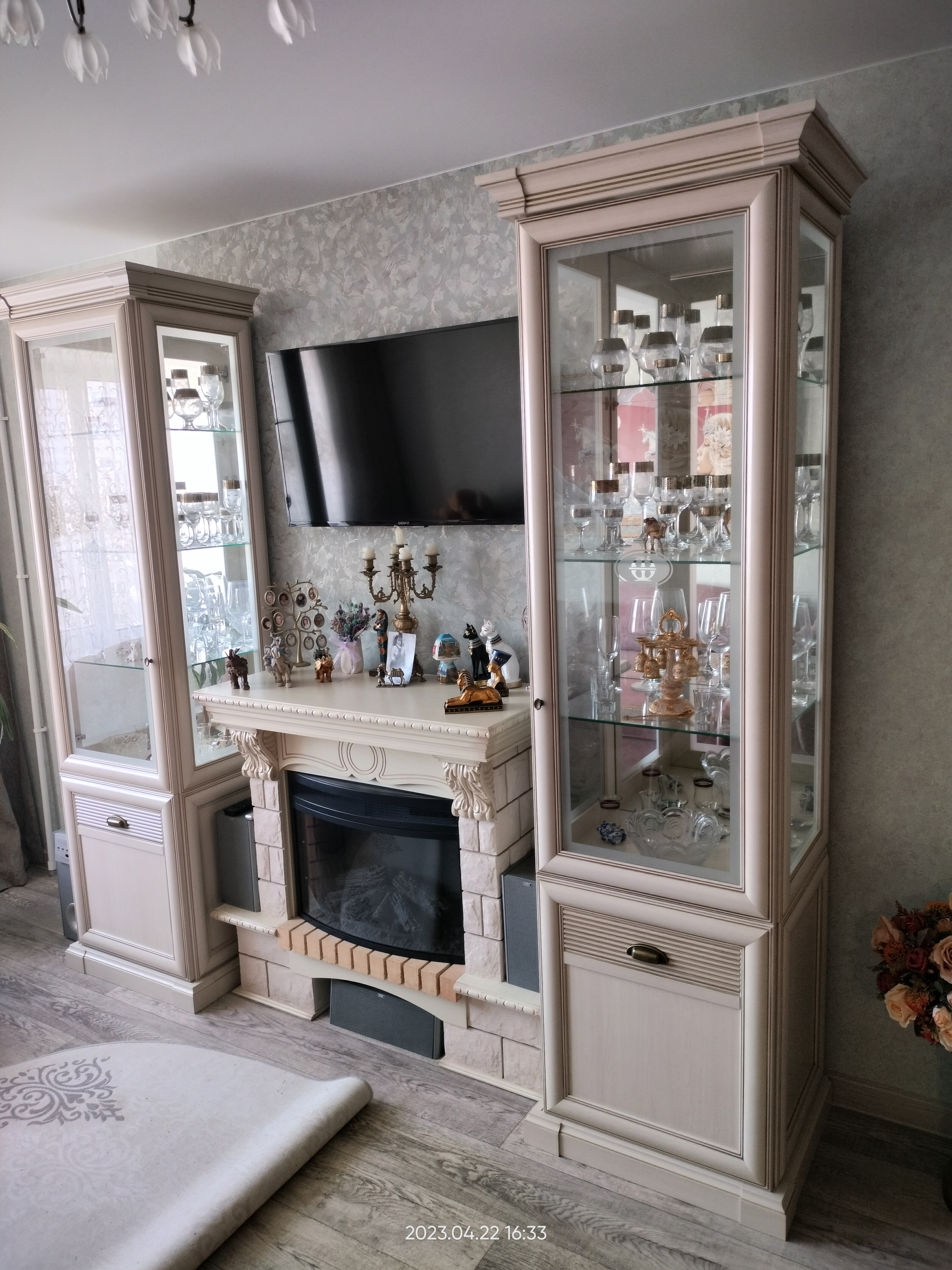 Изделие состоит из основного вместительного отсека и двух нижних отделений с отдельной распашной дверцей, декорированной сложной фрезеровкой. Комплектация может быть изменена на три стеклополки + полочку из ЛДСП. Верхняя створка имеет встроенную зеркальную панель, отделанную по технологии фацетирования, или матированное стекло, позволяющее демонстрировать внутреннее содержимое. Модель оснащена надежной фурнитурой и прочными мебельными механизмами от ведущих производителей Германии или Австрии. Для данной позиции возможна доставка и сборка на месте.