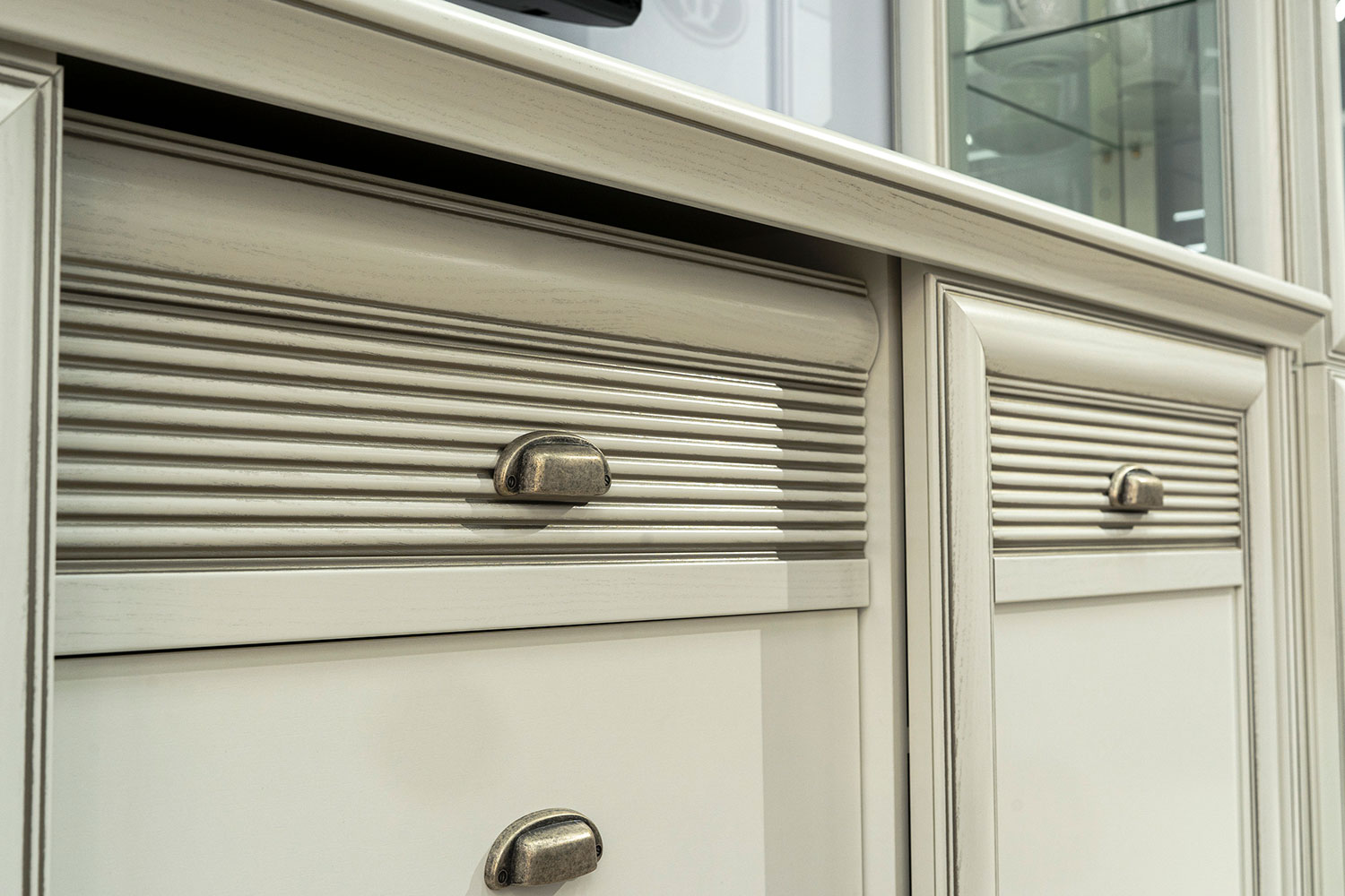 - Фасады ящиков и раздвижных дверей из ЛДСП с наклеенным профилем;