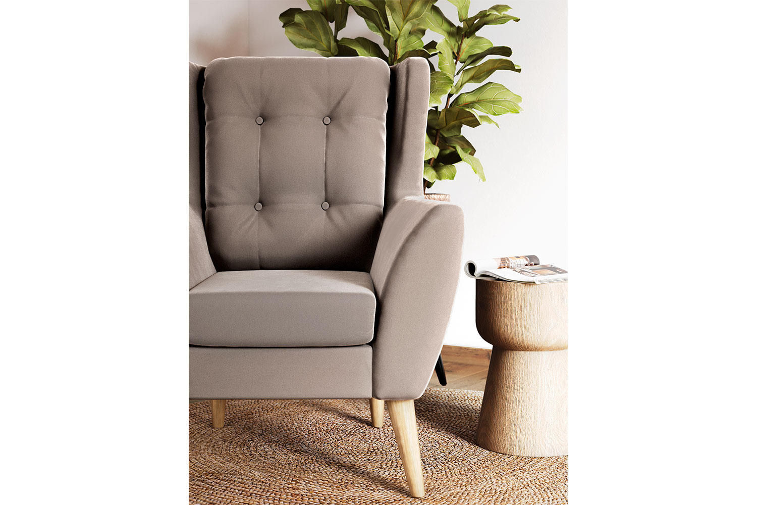 Модель «wing chair» выглядит изысканно и элегантно. Высокая, слегка изогнутая спинка и удобные подлокотники обеспечивают комфортную посадку. Светлые скошенные ножки из массива дерева контрастируют с основным цветом мебели и органично выделяются в конструкции. Обтекаемые формы и выступающие «уши» делают кресло подходящим для интерьера в английском стиле, особенно удачно кресло будет смотреться рядом с камином. Минималистичный дизайн позволяет использовать модель и для оформления обстановки в стиле лофт или сканди, гостиной, домашней библиотеки и рабочего кабинета.
