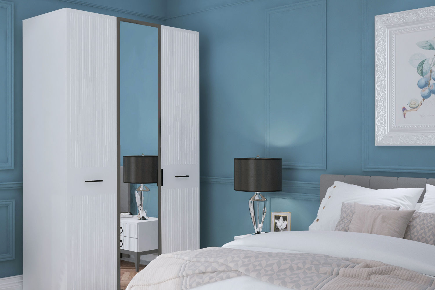 Комплект состоит из трехстворчатого шкафа, кровати с мягким изголовьем, двух небольших тумб и стола с пятью выдвижными ящиками, который с легкостью заменит привычный туалетный столик. Высокие скошенные опоры из массива бука облегчат уборку, а настенное зеркало и зеркальная вставка системы хранения помогут в процессе сборов. Корпусная часть меблировки изготовлена из ЛДСП, а фасады — из МДФ, окутанной ПВХ-пленкой оттенка «белый премиум». Модульность гарнитура предполагает возможность выбора мебельных изделий по размерам и функционалу.