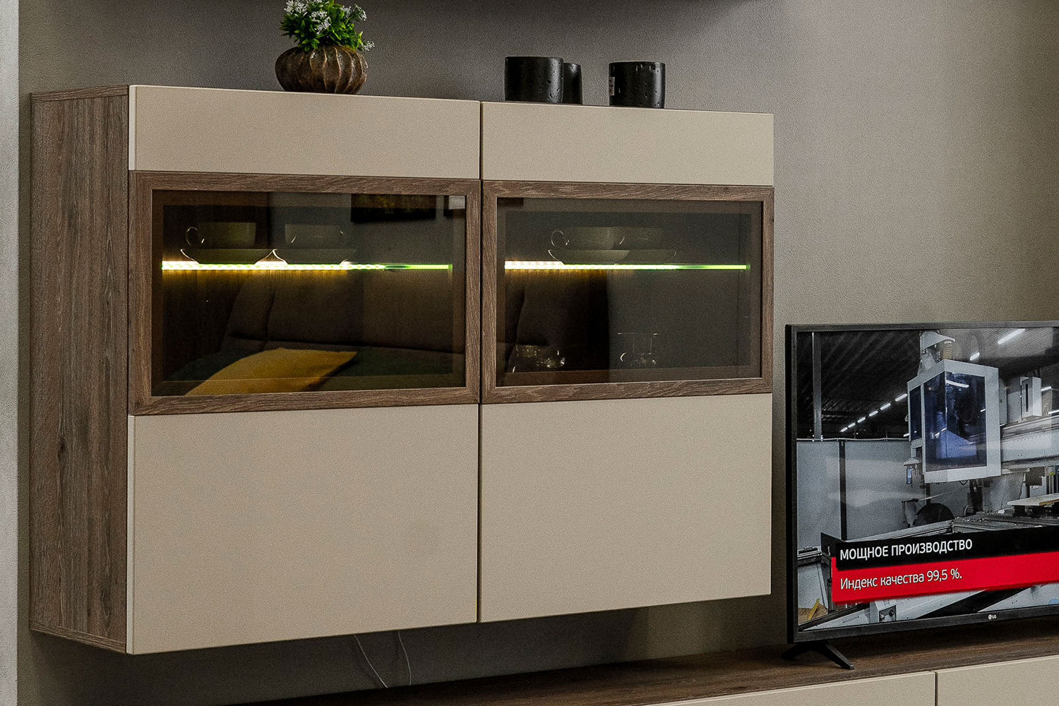 В набор входят два навесных шкафчика, две небольшие настенные полки, напольный шкаф и компактная ТВ-тумба с четырьмя выдвижными ящиками разного размера. Матовые светлые поверхности разбавлены полупрозрачными вставками, обрамленными более темным профилем. Эстетичное стекло StopSol с пиролитическим отражающим покрытием скрывает содержимое отсеков при дневном свете и подчеркивает его при включении внутренней LED-подсветки. Скрытая фурнитура делает мебель более воздушной и легкой.
