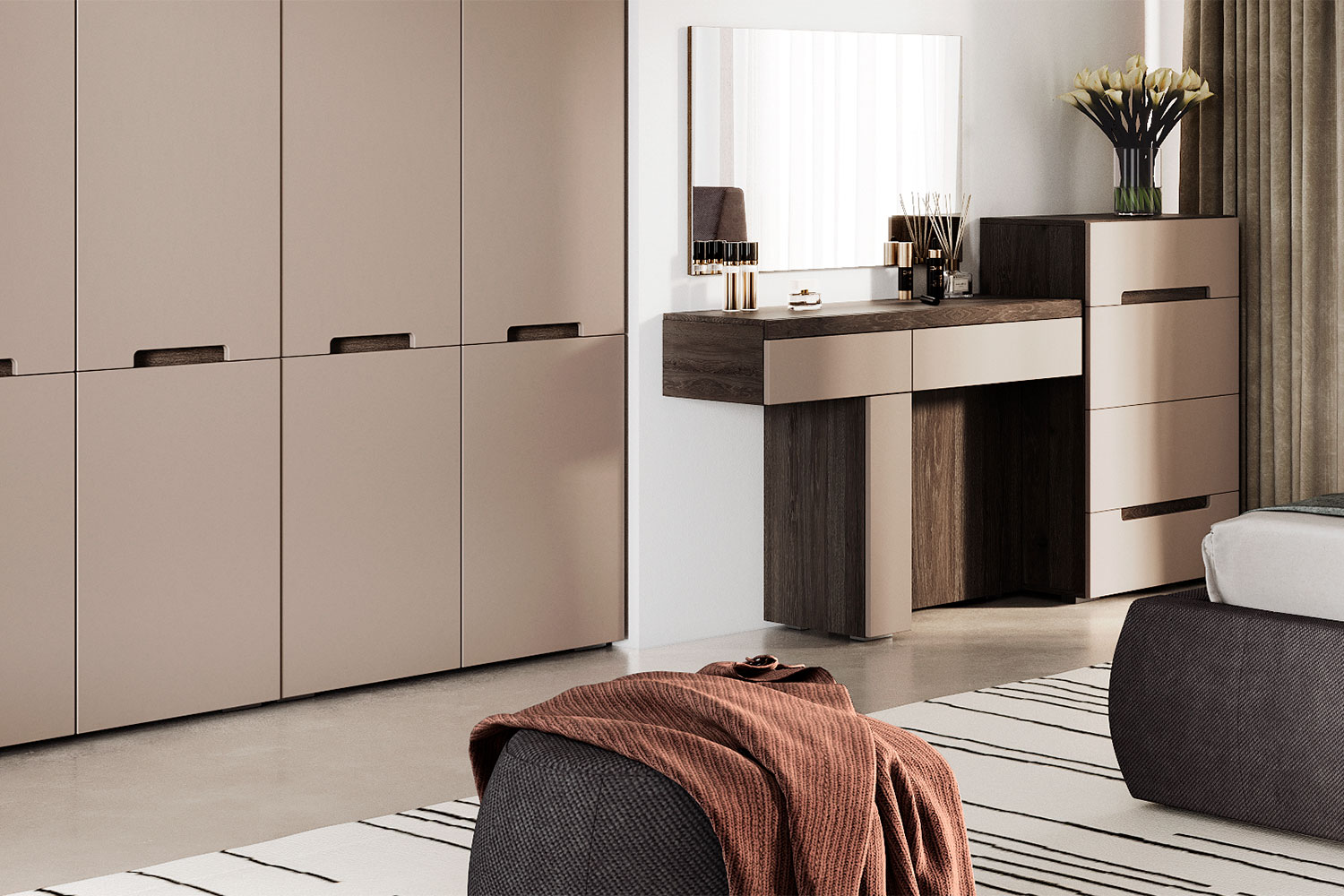 - Для спальни используется крепежная фурнитура и механизмы ведущих производителей. Такая фурнитура позволит мебели прослужить дольше, не требуя частого ремонта. Петли оснащены доводчиками для более плавного закрывания дверей;